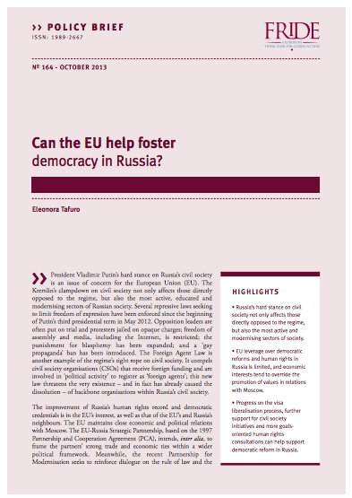 President Vladimir Putin’s hard stance on Russia’s civil society is an issue of concern for the European Union (EU). The Kremlin’s clampdown on civil society not only affects those directly opposed to the regime, but also the most active, educated and modernising sectors of Russian society. EU leverage over democratic reforms and human rights in Russia is limited, and economic interests tend to override the promotion of values in relations with Moscow. Progress on the visa liberalisation process, further support for civil society initiatives and more goals-oriented human rights consultations can help support democratic reform in Russia.