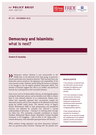 This paper argues that democracy without Islamists is now inconceivable in the Middle East. Their exclusion from any democratic process would put the legitimacy and sustainability of the entire process at stake. However, merely lifting the barriers to inclusion is not enough to cure the region’s persistent democratic deficit. It is necessary to revisit socio-economic structures, broaden participation and implement comprehensive transitional justice processes that confer legitimacy on emerging political systems. Even among radicals, such measures can help reduce the incentives for resorting to violence. Among organisations committed to engagement, they can help transcend ideological dogmas.